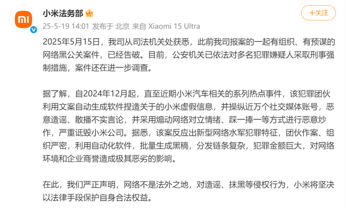 据了解,自2024年12月起,直至近期小米汽车相关的系列热点事件,该犯罪团伙利用文案自动生成软件捏造关于的小米虚假信息,并操纵近万个社交媒体账号,恶意造谣、散播不实言论,并采用煽动网络对立情绪、踩一捧一等方式进行恶意炒作,严重诋毁小米公司。据悉,该案反应出新型网络水军犯罪特征,团伙作案、组织严密,利用自动化软件,批量生成黑稿,分发链条复杂,犯罪金额巨大,对网络环境和企业商誉造成极其恶劣的影响。