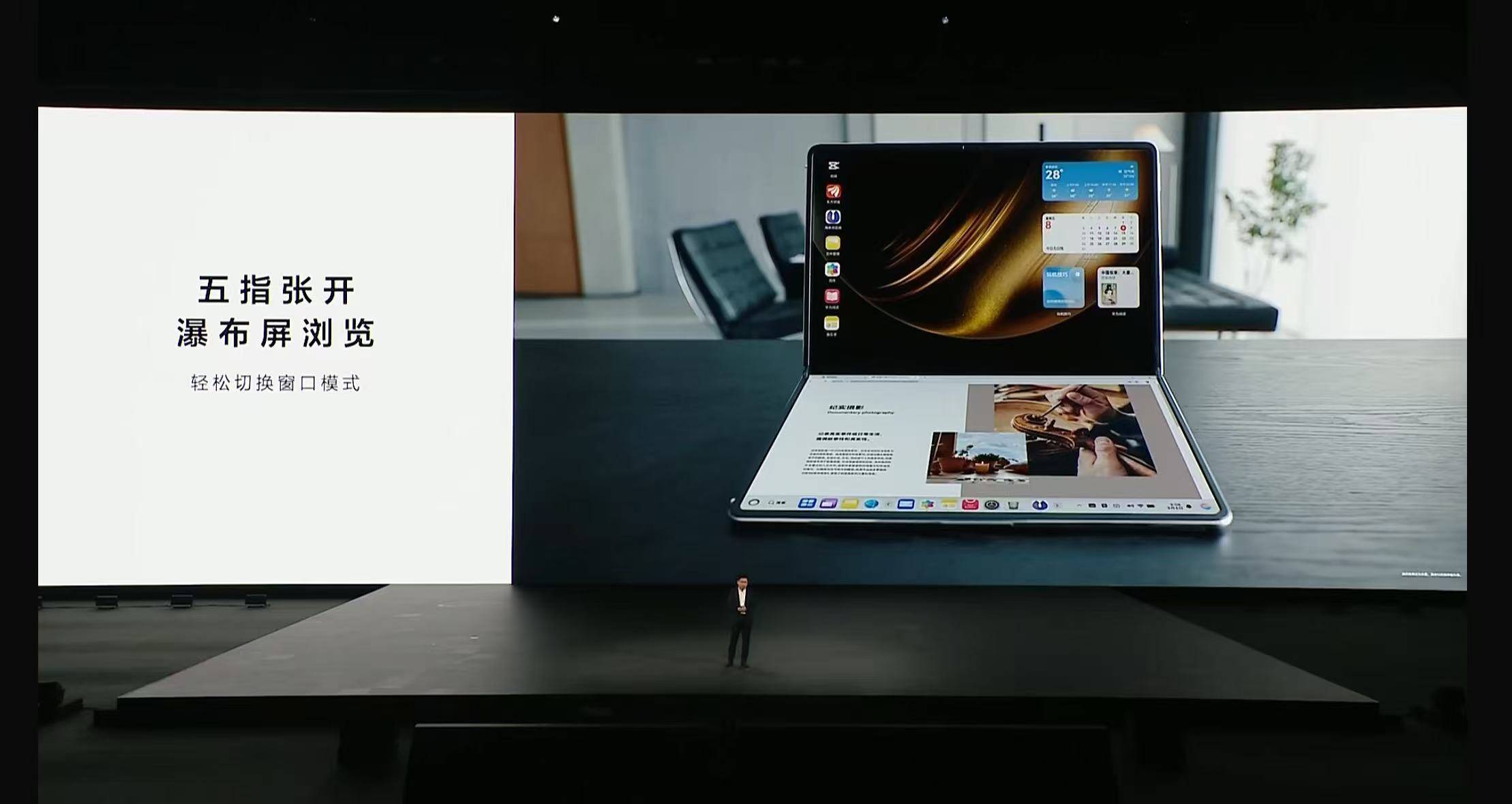 发布会上,华为18英寸的折叠屏电脑MateBook Fold非凡大师亮相。该款电脑采用超轻薄折叠设计,18英寸大屏沉浸,13英寸小巧便携,展开薄至7.3mm,重量仅1.16kg。