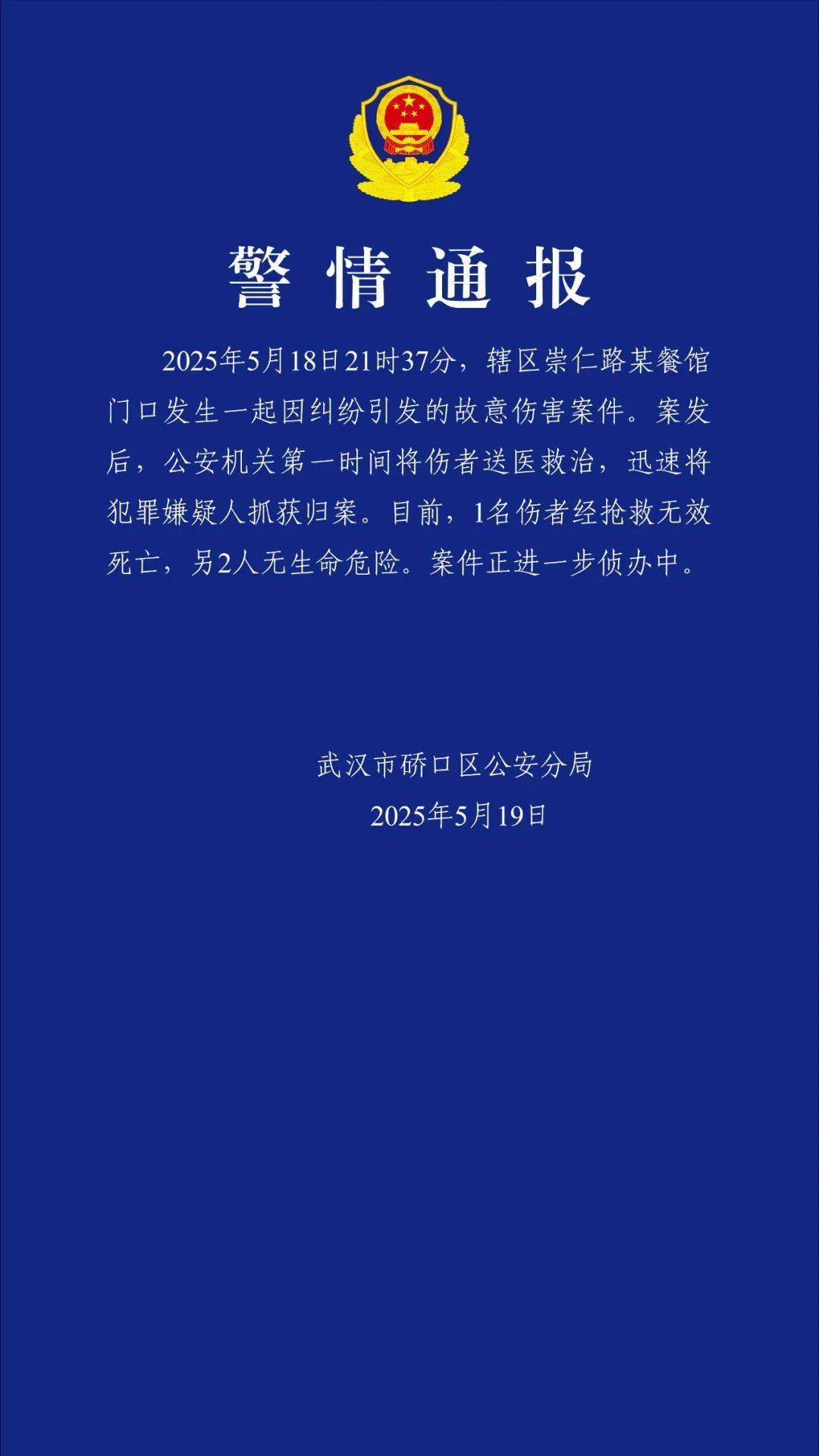 2025年5月18日21时37分,辖区崇仁路某餐馆门口发生一起因纠纷引发的故意伤害案件。案发后,公安机关第一时间将伤者送医救治,迅速将犯罪嫌疑人抓获归案。目前,1名伤者经抢救无效死亡,另2人无生命危险。案件正进一步侦办中。 返回搜狐,查看更多
