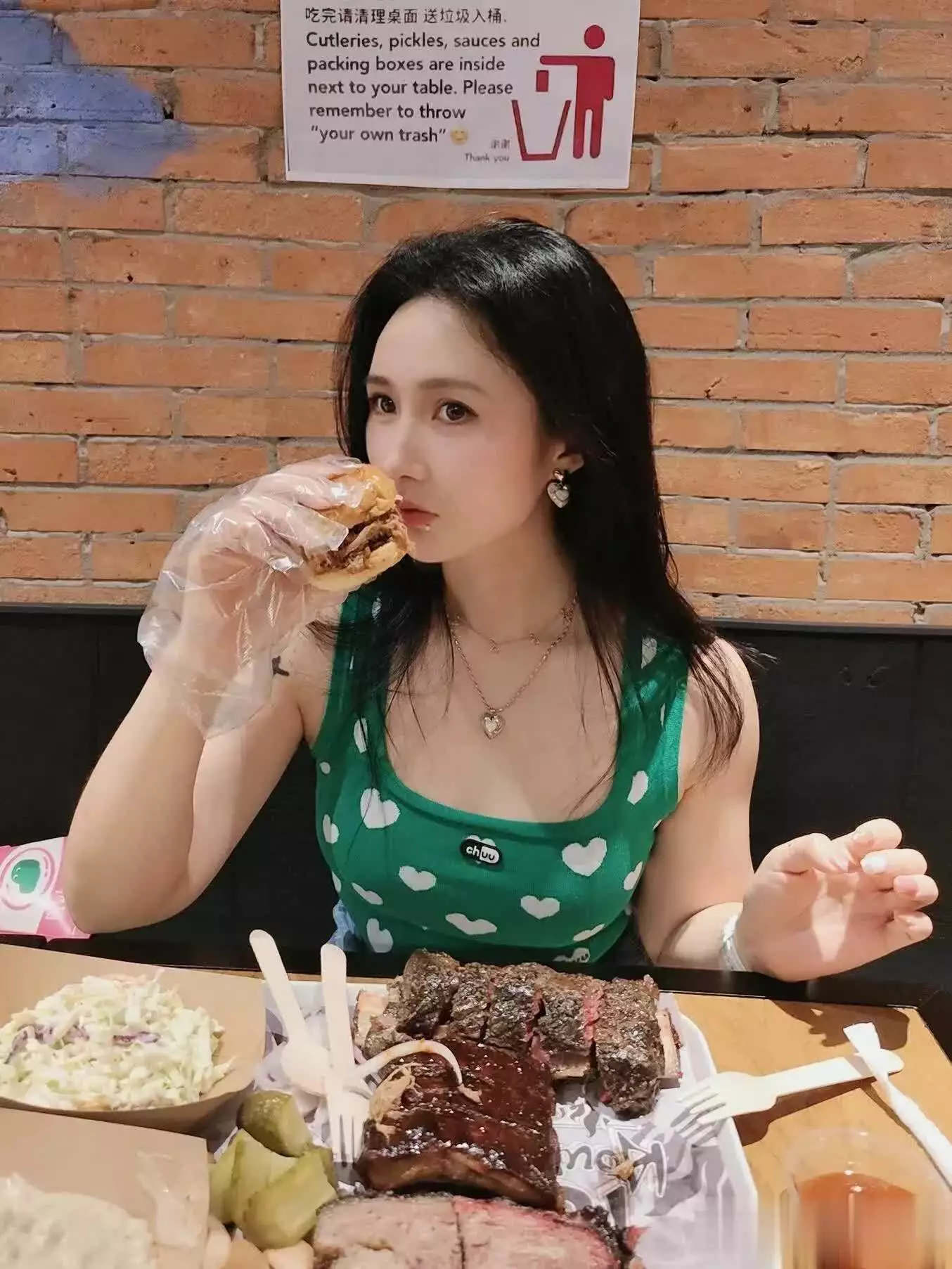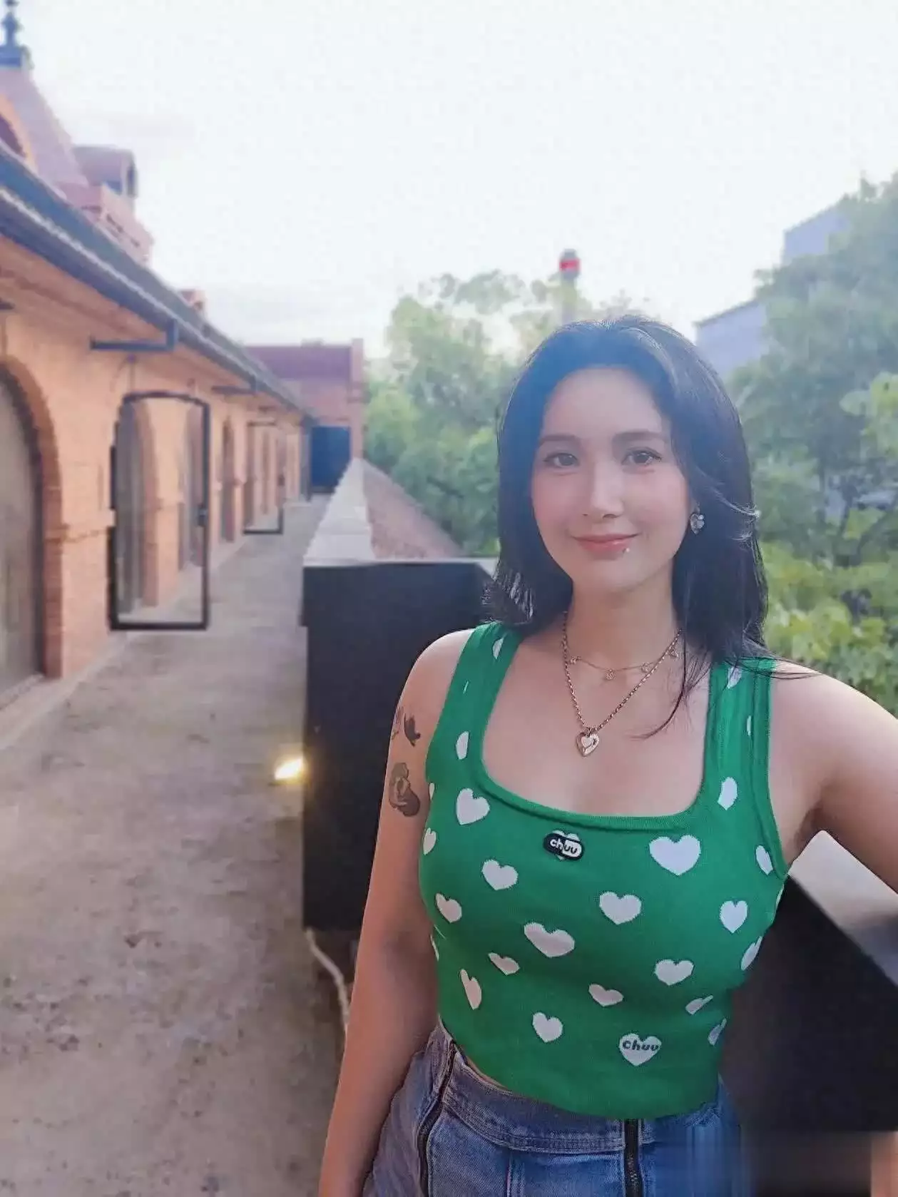 照片中的女性,身着绿色背心与牛仔裤,简约而不失时尚感。项链与吊坠轻轻垂落,为她增添了几分柔美与精致。她的黑发如瀑,自然披散,更显得她温婉可人。最引人注目的,莫过于她那灿烂的笑容和直视镜头的眼神,仿佛在与每一位观者进行心灵的交流,传递着温暖与亲切。
