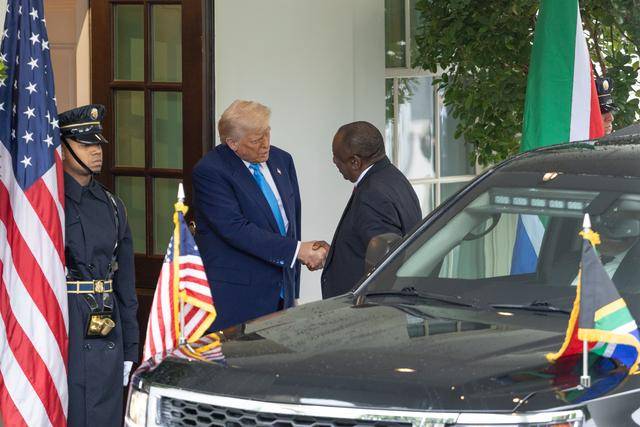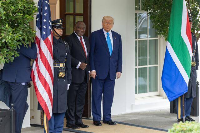 5月21日,美国总统特朗普(右)在华盛顿白宫迎接到访的南非总统拉马福萨(中)。新华社记者 胡友松 摄返回搜狐,查看更多