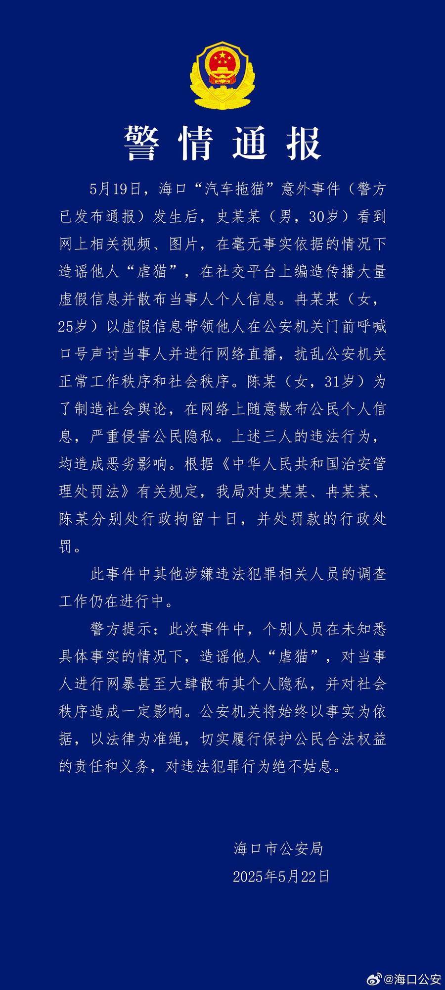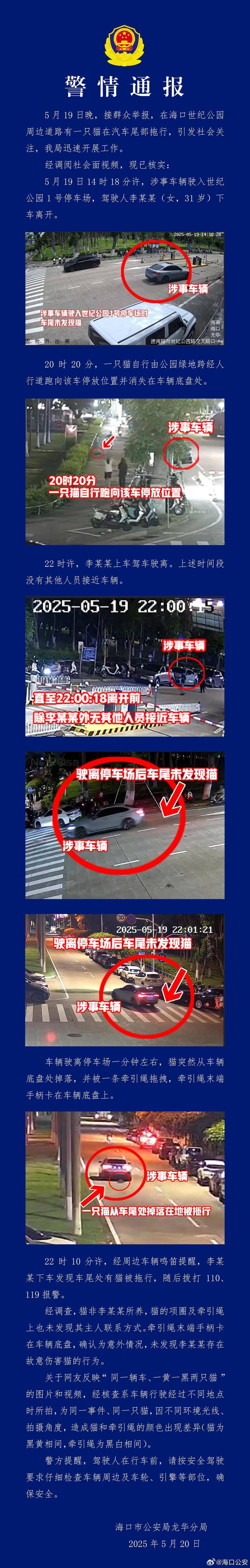 5月20日,海口市公安局龙华分局发布警情通报,公布事件相关视频画面,证明该事件系意外,未发现司机故意虐猫行为。
