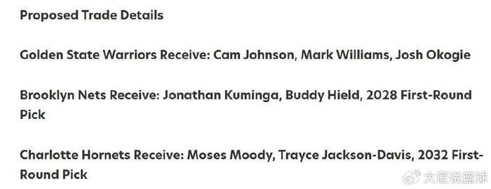 黄蜂得到:穆迪+TJD+2032年首轮签。