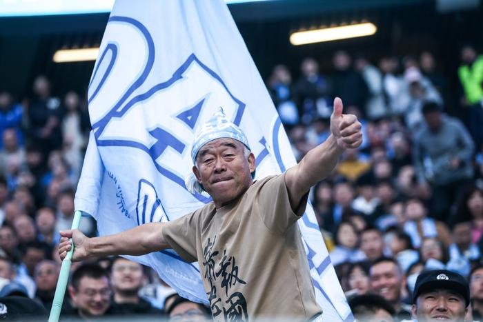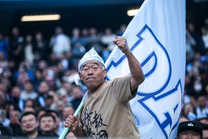 在散客球迷看台领喊的王大爷,来自古城金州的王大爷属虎,已经76虚岁,但依然精力旺盛,毫无保留地为大连足球呐喊助威。