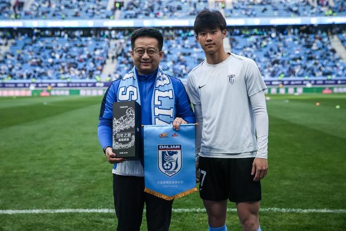 赛前,小将杨铭锐为远征球迷代表颁奖。