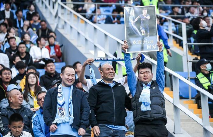 看台上,球迷高举于汉超的大幅照片,欢迎出生于大连的于汉超回家。