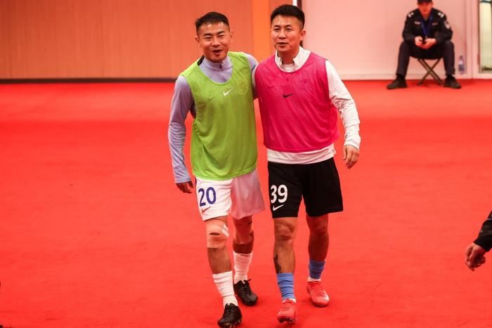 赛前,于汉超与大连英博海发队长阎相闯一起走过球员通道。