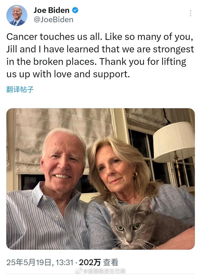#拜登患癌# 拜登今天在社交网发文:“癌症影响着我们每一个人。和你们中的许多人一样,吉尔和我也深知,正是在破碎的地方,我们变得最坚强。感谢你们用爱与支持鼓舞我们”。