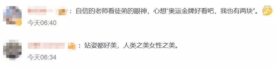 还有网友说,“自信的老师看徒弟的眼神,心想:‘金牌好看吧,我也有两块’。”
