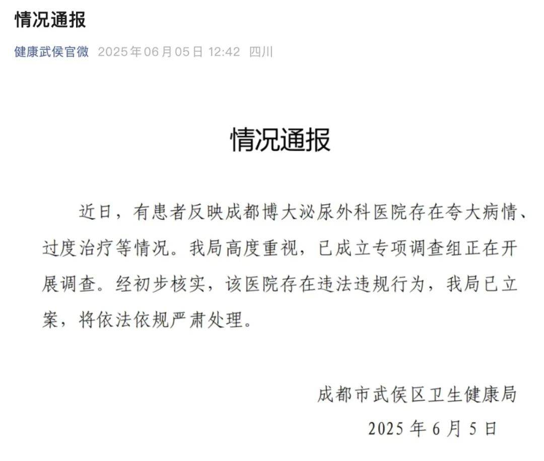 近日,有患者反映成都博大泌尿外科医院存在夸大病情过度治疗等情况。卫健局高度重视,已成立专项调查组正在开展调查。经初步核实,该医院存在违法违规行为,该局已立案,将依法依规严肃处理。
