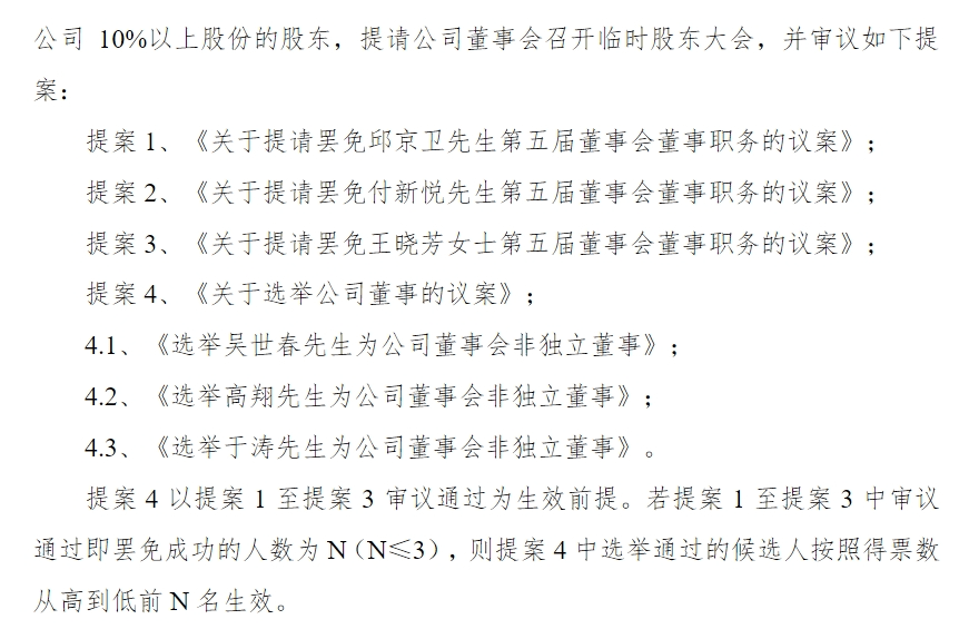吴世春等人的提案有4个,前3个提案是提请罢免邱京卫、付新悦、王晓芳的董事职务,第4个则是要求选举吴世春、高翔、于涛为董事会非独立董事。其中,提案4以提案1至提案3审议通过为生效前提。