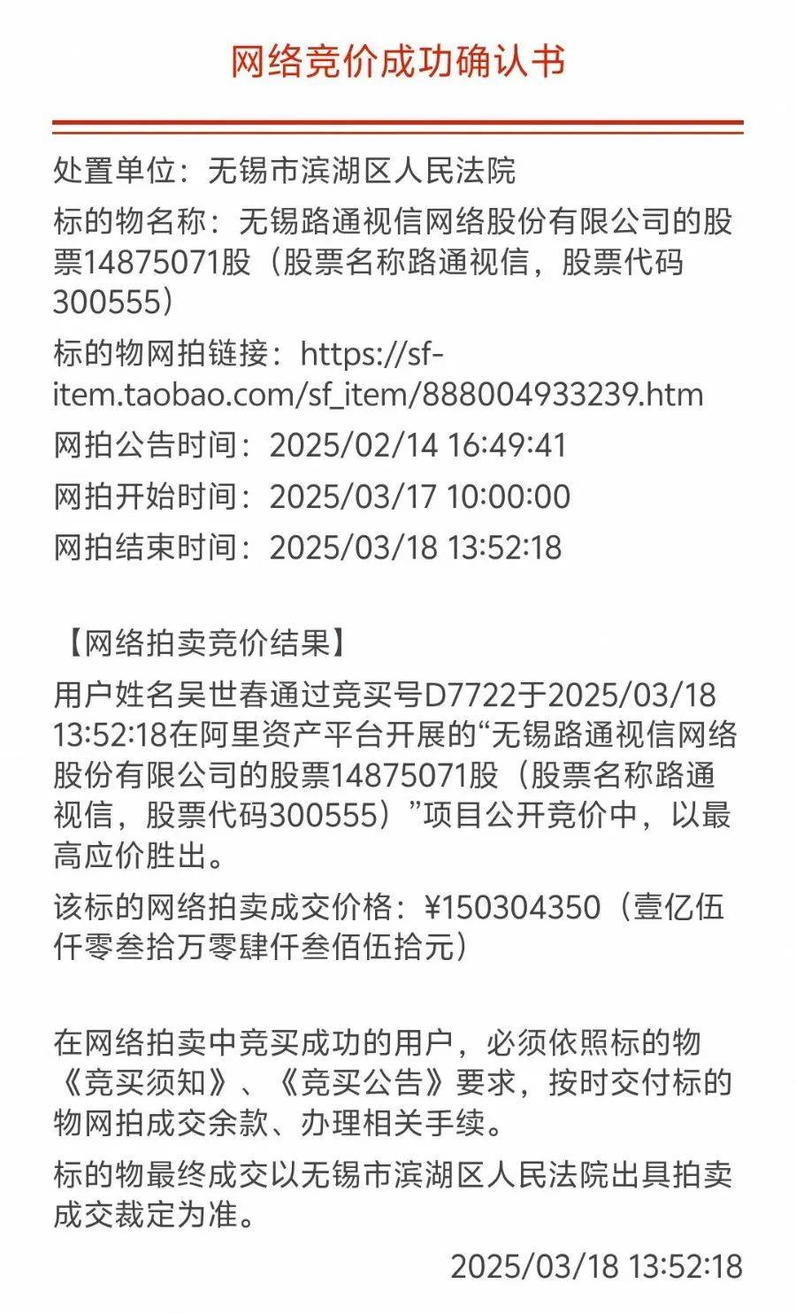 今年以来,华晟云城持有的股权多次被拍卖。阿里拍卖显示,吴爱军于1月以9016.85万元拍下1022.62万股(占公司总股本5.11%),吴世春于3月以1.50亿元拍下1487.50万股(占公司总股本7.44%)。