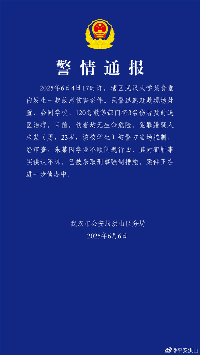 6月6日,武汉市公安局洪山区分局通报,6月4日17时许,辖区武汉大学某食堂内发生一起故意伤害案件。民警迅速赶赴现场处置,会同学校、120急救等部门将3名伤者及时送医治疗。目前,伤者均无生命危险。犯罪嫌疑人朱某(男,23岁,该校学生)被警方当场控制。经审查,朱某因学业不顺问题行凶,其对犯罪事实供认不讳,已被采取刑事强制措施。案件正在进一步侦办中。
