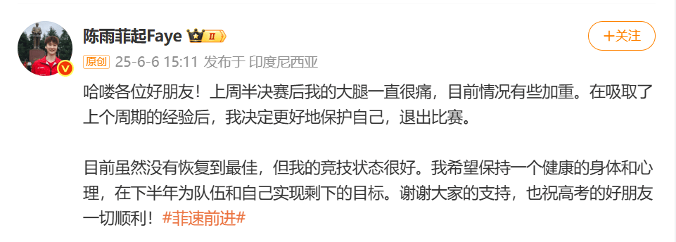 6月6日,国羽选手陈雨菲在个人社媒发文,宣布自己因为大腿伤势,不得不退出印尼羽毛球公开赛,她的国际赛场连胜纪录也就此停留在24场。