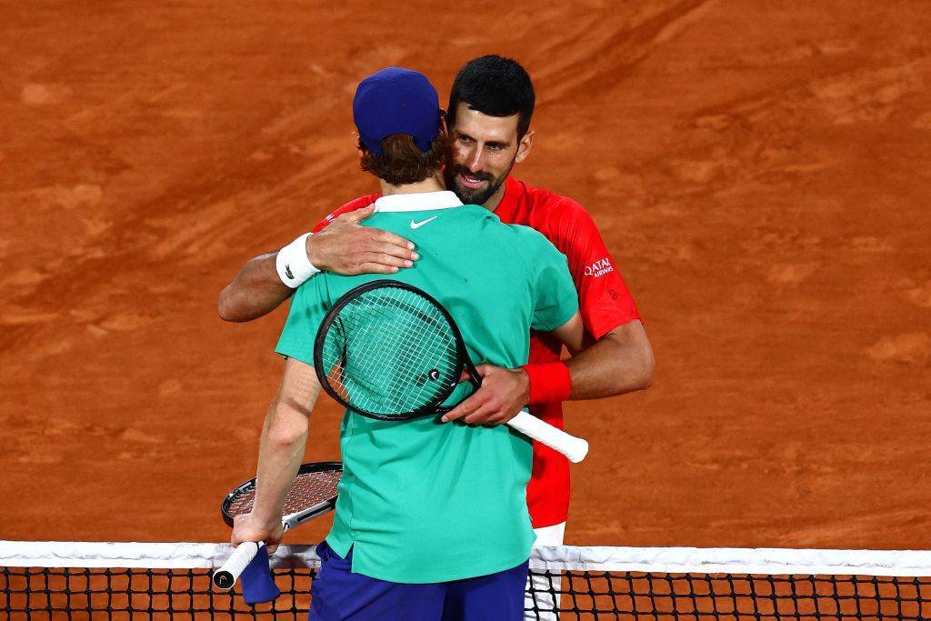 德约科维奇与辛纳拥抱。