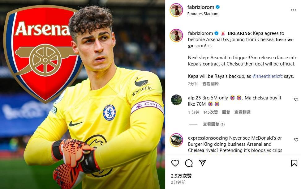 罗马诺表示:凯帕已经同意从切尔西转投阿森纳,Here We Go Soon!接下来阿森纳将触发凯帕合同中500万镑的解约条款,将这笔交易正式化。