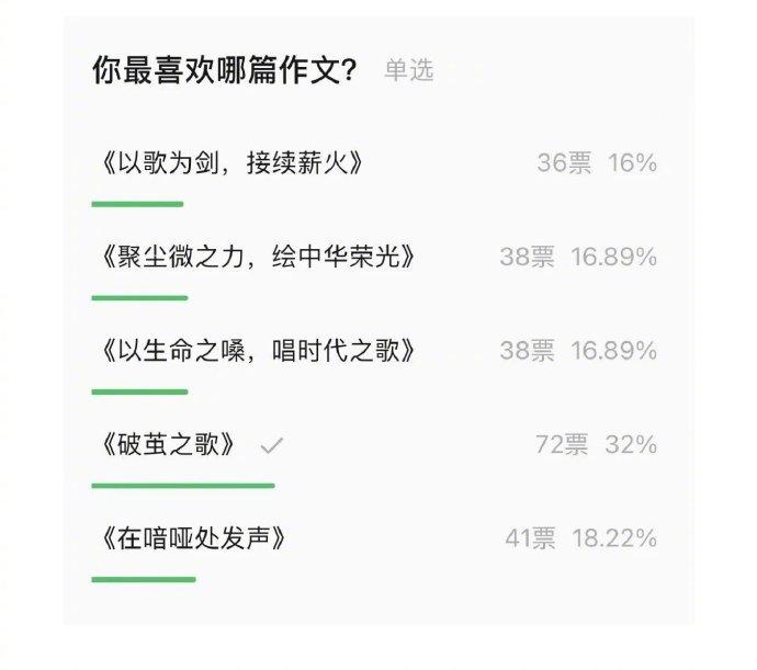 答案大公开:《以歌为剑,接续薪火》 作者:南京市中华中学高一年级丁锦萱;《聚尘微之力,绘中华荣光》作者:江苏省曲塘高级中学高二年级钱绎如;《以生命之嗓,唱时代之歌》来自“豆包”;《破茧之歌》来自“文心一言”;《在喑哑处发声》来自“DeepSeek”!你猜对了吗?