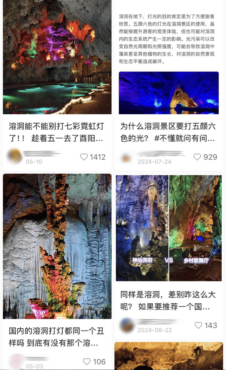 看着灯红酒绿的钟乳石,中国地质学会洞穴专业委员会早在十多年前就指出,五颜六色的灯光不仅会对溶洞内的生态系统产生影响,造成光污染,还容易破坏溶洞中藻类甚至其他植物的生长环境。