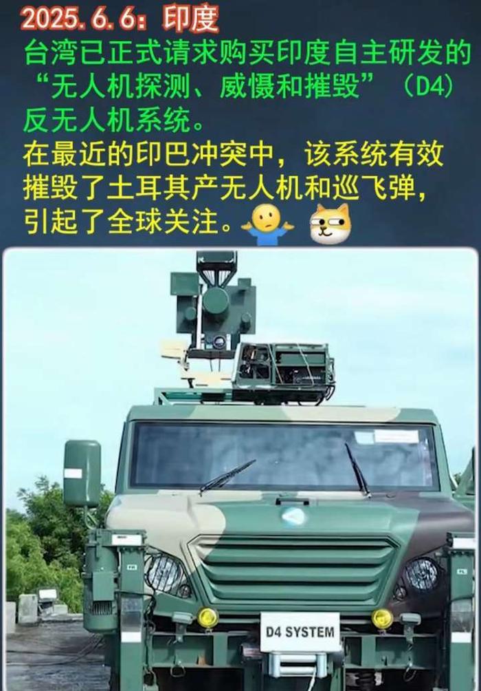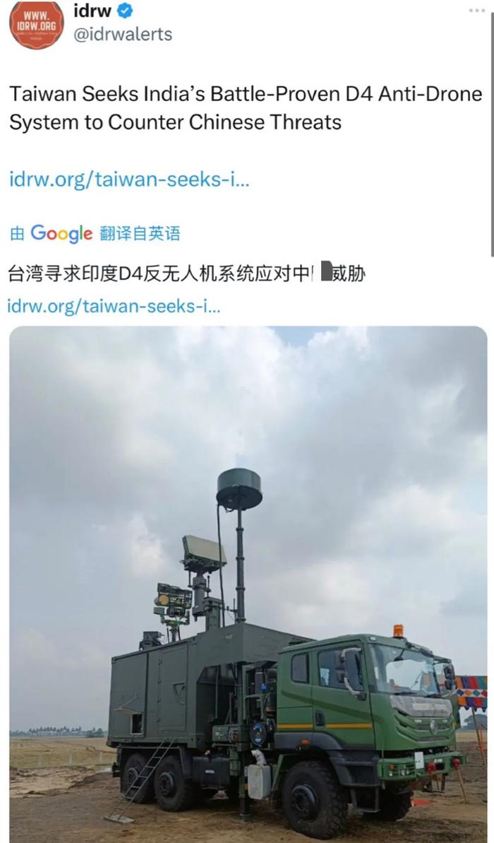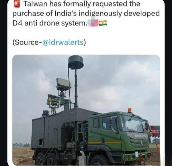 6月6日,来自印度国防研究院和印度军事网站idrw的报道称台湾寻求购买印度D4反无人机系统,这是一条值得关注的消息。我国台湾省欲向印度购买D4反无人机系统。