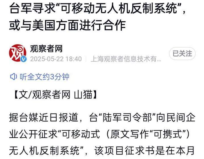 消息来源:观察者网5月22日报道《台军寻求“可移动无人机反制系统”,或与美国方面进行合作》