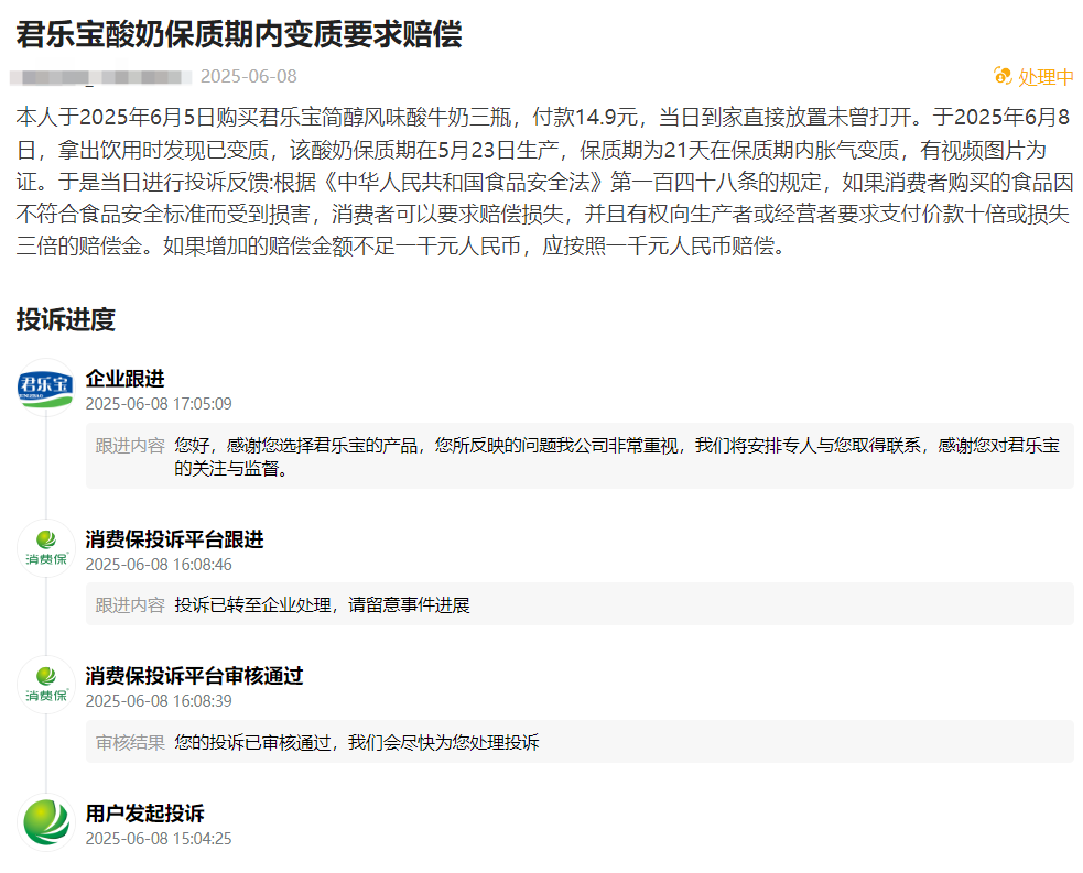 6月8日,君乐宝企业跟进,称重视问题,会安排专人联系处理,感谢监督。截至发稿,投诉仍处“处理中”状态。