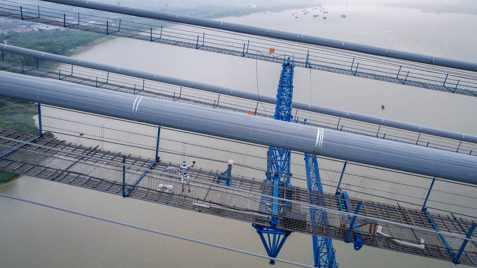 据悉,燕矶长江大桥是世界最大跨径四主缆悬索桥,同时也是世界首座不同垂度四主缆双层钢桁梁悬索桥。全桥四根主缆总长约12公里,所有钢丝长约33万公里,可绕地球赤道8圈,重约6.5万吨,相当于在两塔之间吊起约7座埃菲尔铁塔,是世界上最长、最重的主缆。成桥阶段单根主缆的最大缆力约7万吨,四根主缆总拉力达28万吨,可轻松拉起6艘中型航母,是世界主缆拉力最大的悬索桥。中交二航局燕矶长江大桥项目技术负责人罗航介绍,为满足大桥上部结构的施工需要,全桥共建设了四条猫道,单条猫道宽3.45米,长约3公里,总长达到了12公里,相当于绕着操场跑30圈,是世界上最长的猫道。