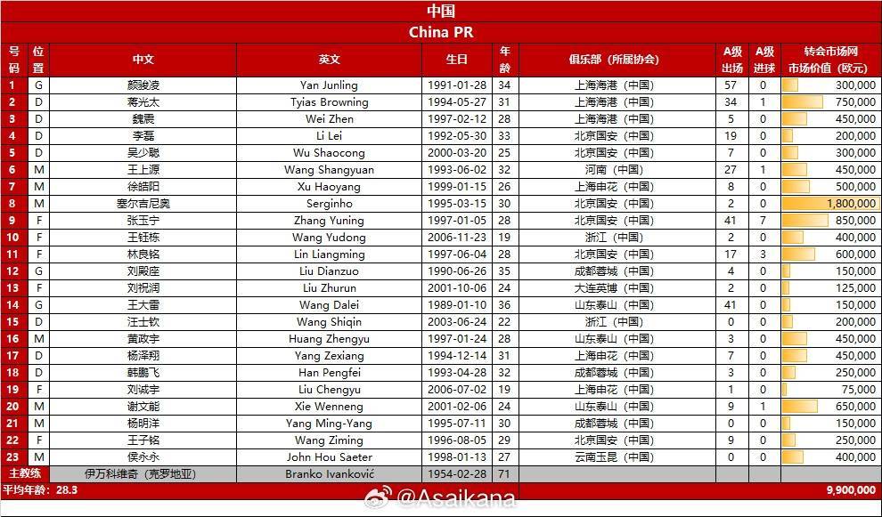 中国vs巴林23人名单附号码:王钰栋新10号,杨明洋侯永永有望首秀