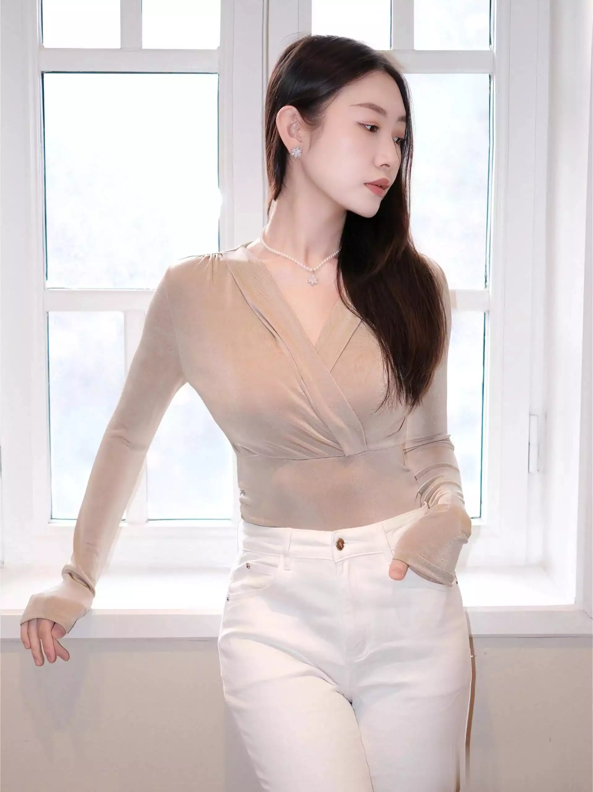 珠珠站在半开的白色门边,她的姿态挺拔而优雅,仿佛自然中最美的风景线。她微微倾斜的身体既自然又充满韵味,似乎在与世界进行某种神秘的对话。手轻轻插在口袋里,这个姿态展现了她的随性自在,同时也流露出难以言喻的自信与从容。