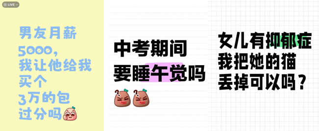 连在一起研读,甚至有种生活调解栏目的味儿,疑问横跨考学、求职、亲子关系以及婚恋关系,且实际数量可能远比你我想象的多。