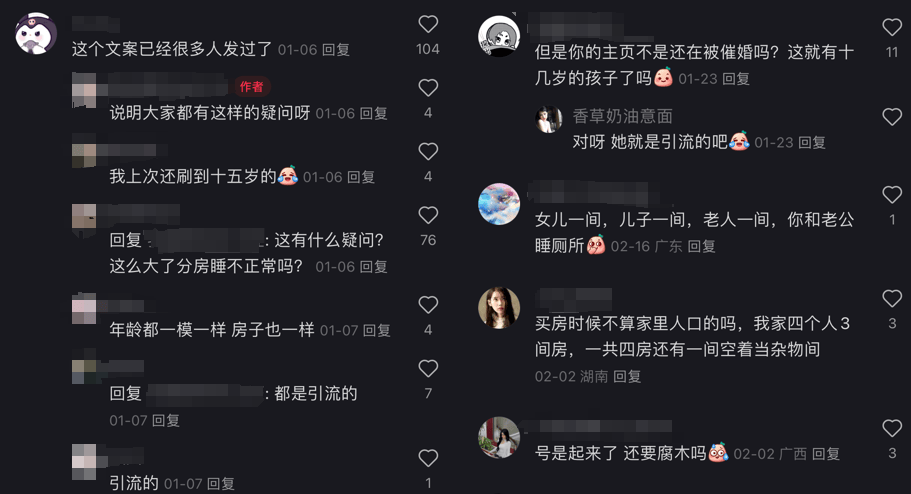 实际上,这类文案的评论区经常会出现 “ 这个文案已经很多人发过了 ”,“ 你这样起号真的合适嘛 ”,认真点的还会进入主页找bug,“ 主页不是还在被催婚嘛?这就有十几岁的孩子了 ”?