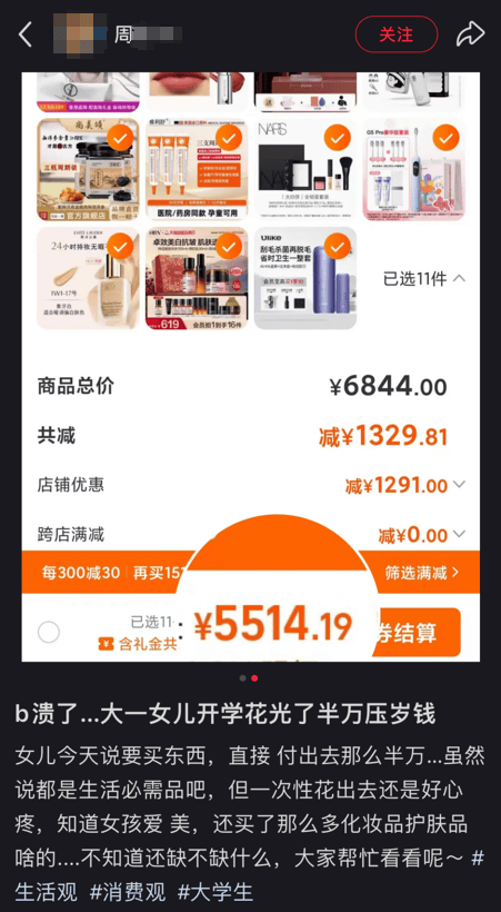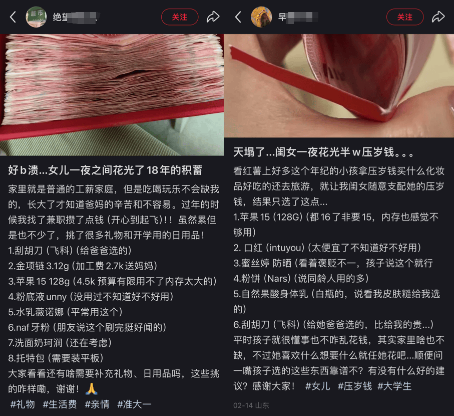 还有这位,起手封面图是一大堆红色钞票,标题是B溃了,大一女儿开学花了半万压岁钱,别以为他真的在等你来一起鸣不平,痛斥女儿。
