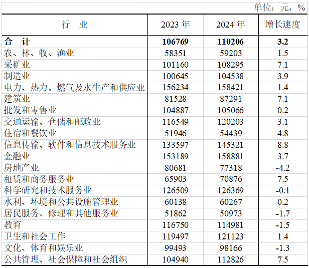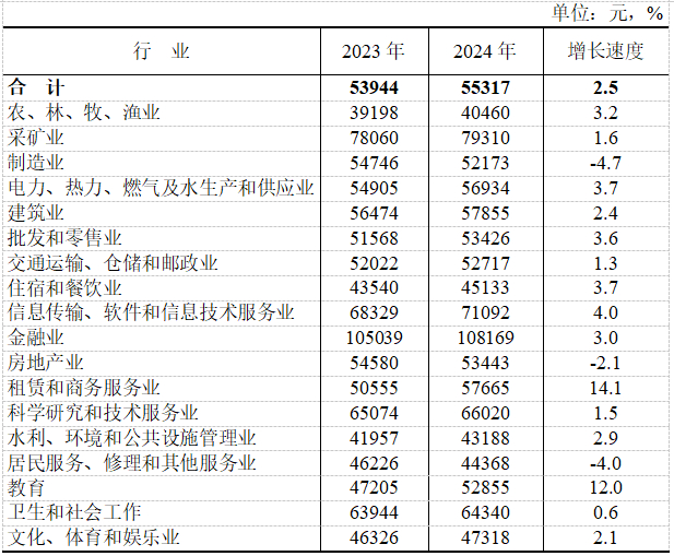 注:图中增速为名义增速,如无特别指出,后续图表中的增速均为名义增速。按行业门类分组的城镇非私营单位就业人员年平均工资详见下表。