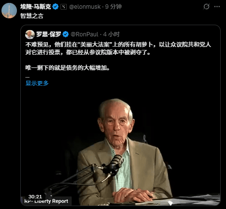 随后,他转发了一系列关于“大而美”法案将造成大幅债务以及诸多负面影响的帖子,并表示自己非常赞同。