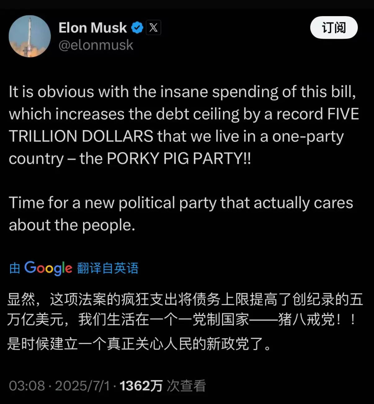 马斯克发布另一条帖子说:“这项疯狂的支出法案将债务上限提高到了创纪录的五万亿美元。显然,这表明我们生活在一个一党制国家——猪小弟党(猪小弟,华纳《乐一通》系列卡通形象之一)!!是时候建立一个真正关心人民的新政党了。”