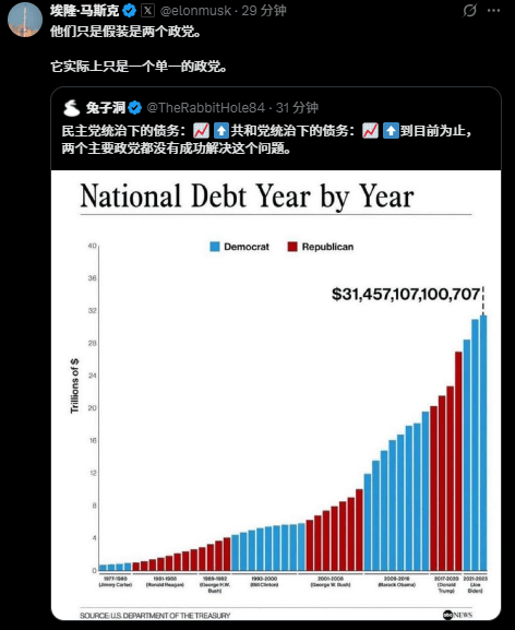 几个小时后,马斯克更进一步表示:“如果这个疯狂的支出法案得到通过,一个新的政党‘美国党’将在第二天成立。”他补充说,“我们的国家需要解决民主党和共和党两党垄断政局的问题,这样人民才能真正发出自己的声音。”