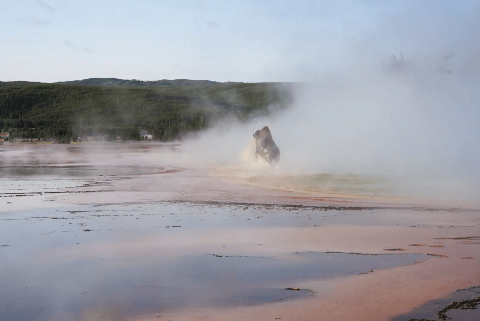 来自科罗拉多州的女游客目睹了全过程。她称,当时看到两头野牛站在温泉附近,便拿起手机准备拍照,不料其中一头野牛突然在温泉区边缘跌倒,坠入滚烫温泉。野牛虽奋力挣扎想回到岸上,却无济于事,霍华德意外拍下了这悲惨画面。