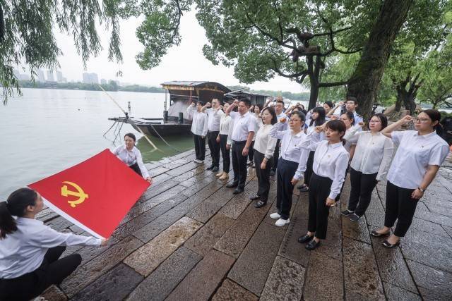 2024年6月28日,党员在浙江嘉兴南湖红船旁重温入党誓词。新华社记者 徐昱 摄