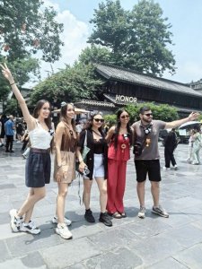 当天下午,达人一行还走进成都宽窄巷子,体验汉服文化。索菲亚特别挑了一件代表中国红颜色的汉服。“中国的文化博大精深,一天下来收获满满,特别期待接下来的行程,尤其想看大熊猫。”索菲亚说。