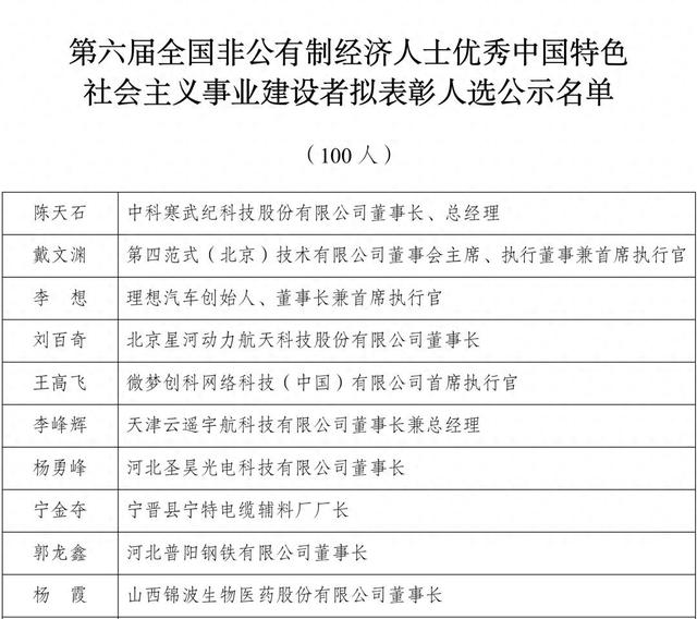 中央统战部、工业和信息化部、人力资源社会保障部、市场监管总局和全国工商联共同开展第六届全国非公有制经济人士优秀中国特色社会主义事业建设者评选表彰活动。为充分发扬民主、广泛听取意见、接受社会监督,现将100名全国非公有制经济人士优秀中国特色社会主义事业建设者拟表彰人选名单和8名后备人选名单予以公示。公示时间从2025年7月7日起,至7月13日止。如对人选名单有异议,请于公示期间通过电话、传真、邮件和信函(以到达日邮戳为准)等方式向第六届全国非公有制经济人士优秀中国特色社会主义事业建设者评选委员会办公室反映。以单位名义反映情况的材料需加盖单位公章,以个人名义反映情况请签署实名,并提供联系电话。