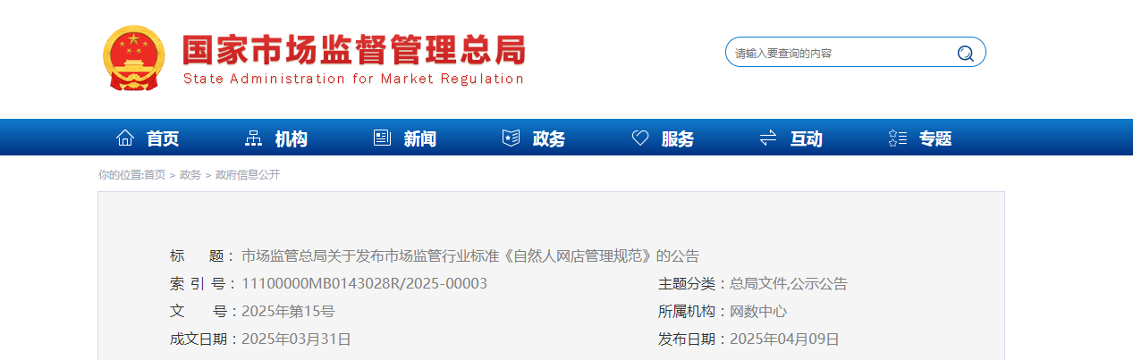 《自然人网店管理规范》(MR/T 0001—2025)行业标准已经市场监管总局批准,现予以公告,自2025年6月1日起实施。