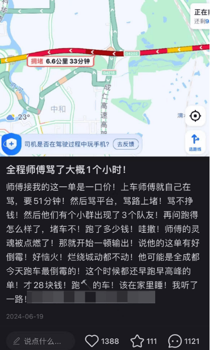 只要遇到拥堵的场景,早晚高峰、音乐节等,就可能出现狠狠上班半小时,到手就九、十块的情况。