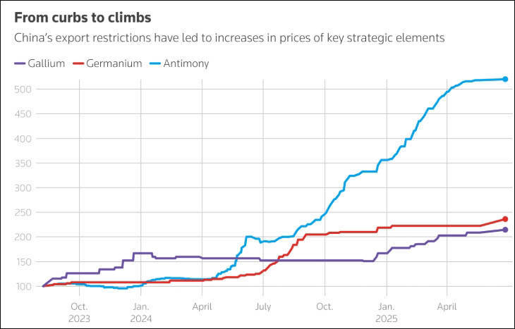 中方出口管制导致镓(紫线)、锗(红线)、锑(蓝线)价格上涨路透社制图