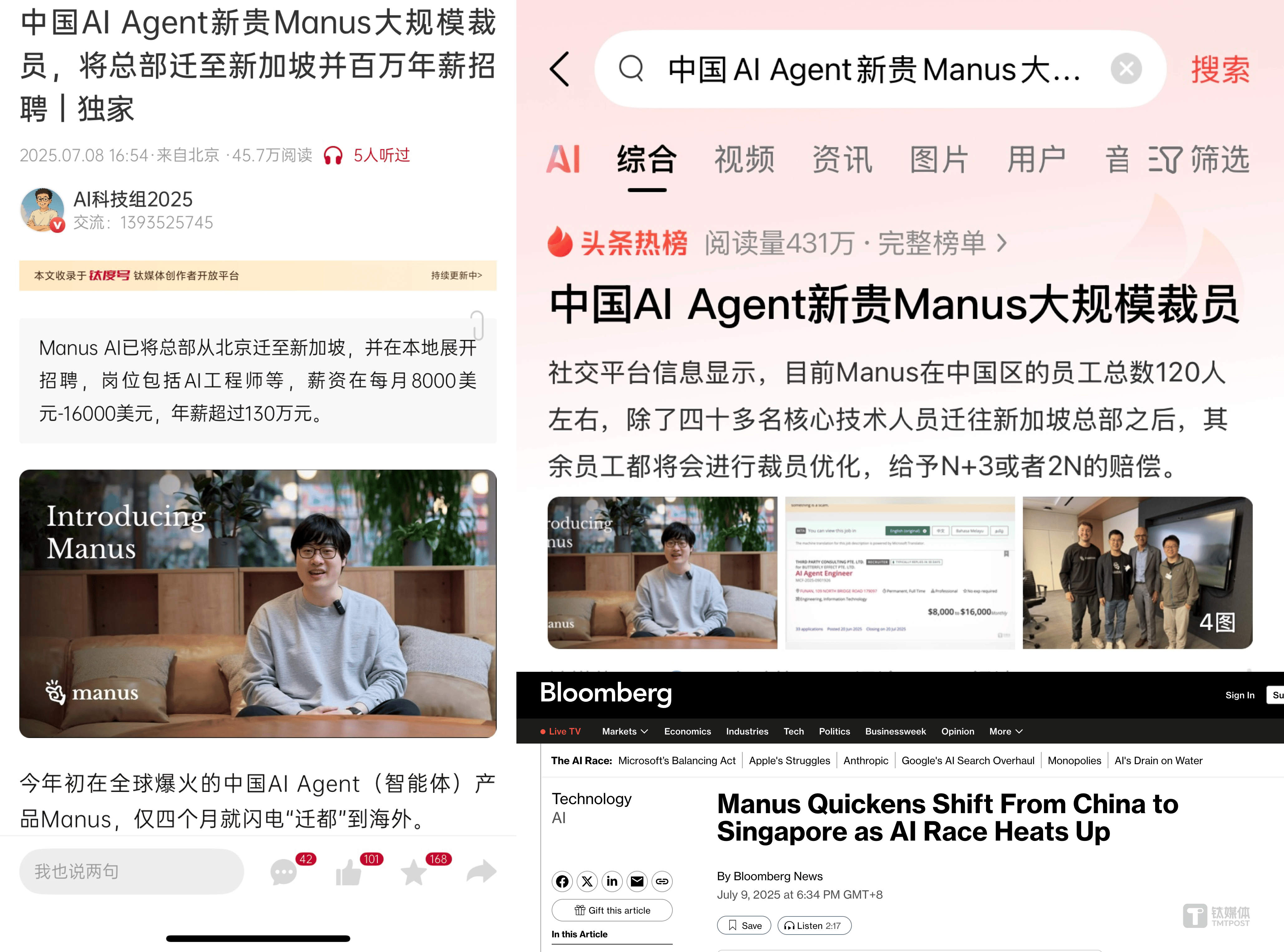 7月8日笔者独家获悉,年初爆火的AI Agent公司Manus(北京蝴蝶效应科技有限公司)近期对国内进行大规模裁员,120名员工中,除40余名核心技术人员迁往新加坡总部,其余皆被裁员,并且将总部从中国迁至新加坡。