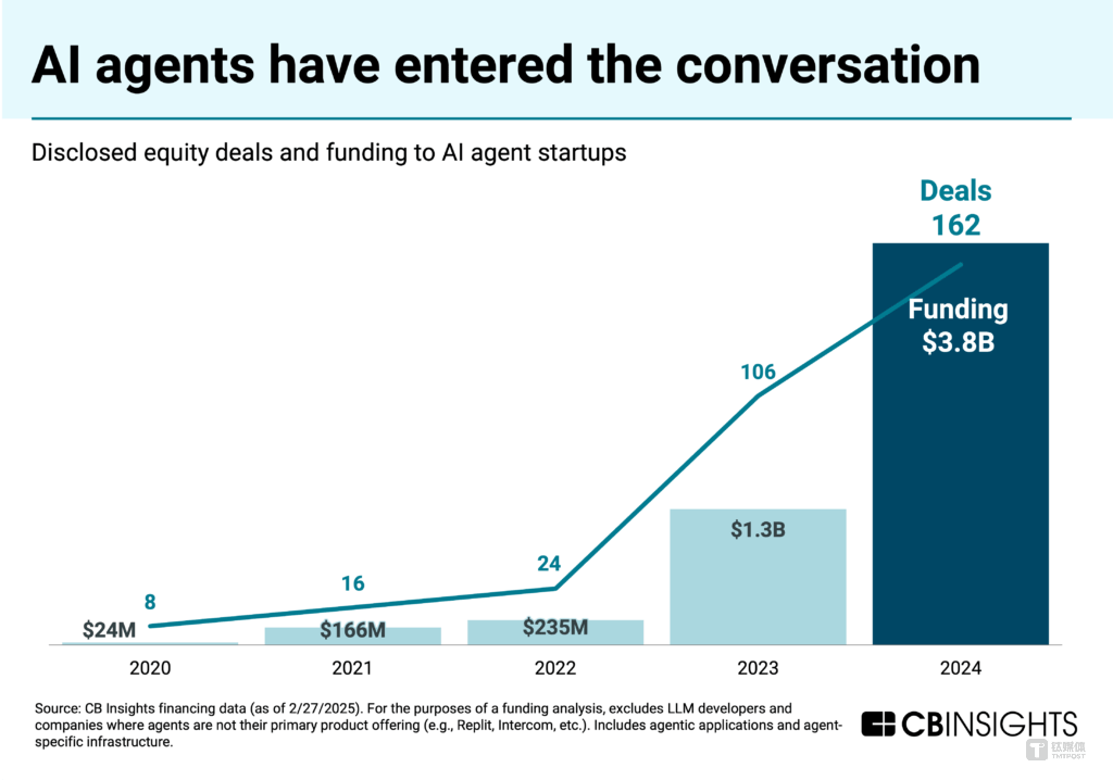 据CB Insights数据显示,2024年,AI Agent初创公司共完成投融资38亿美元,同比(2023年)增长了3倍。同时,所有大型科技公司都已开始开发AI代理或为其提供工具,应用于金融服务和保险、医疗保健、工业等领域。