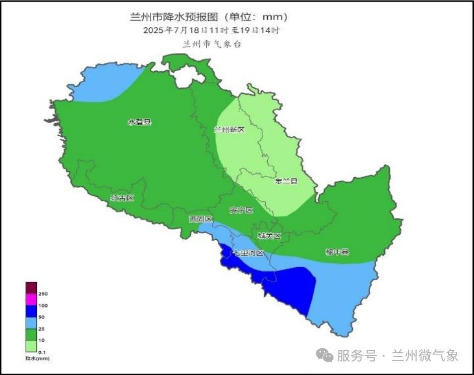受冷空气影响,预计7月18日至19日白天,兰州市将有明显降水降温天气,七里河、西固东南部、榆中中南部及永登西北部可达大到暴雨,降水量35~60毫米,其余地区以中雨为主,降水量8~25毫米,最大小时雨强15~25毫米,降水时段为18日11时至19日14时。伴随降水,19日全市最高气温将下降10℃~12℃,市区最高气温降至25℃。需防范局地短时强降水引发的中小河流洪水、山洪、城市暴雨积涝及累积降水较大引发的滑坡、崩塌等地质灾害。