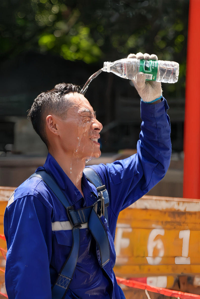 ▲7月16日,国网眉山东坡区供电中心配网班作业人员完成配变更换工作后用凉水解暑 牟雯雯摄为保障电网安全稳定运行,有关部门和专家倡议广大用户科学用电、节约用电、错峰用电,尽量避开高峰时段使用大功率电器,将空调温度设置在26℃及以上。