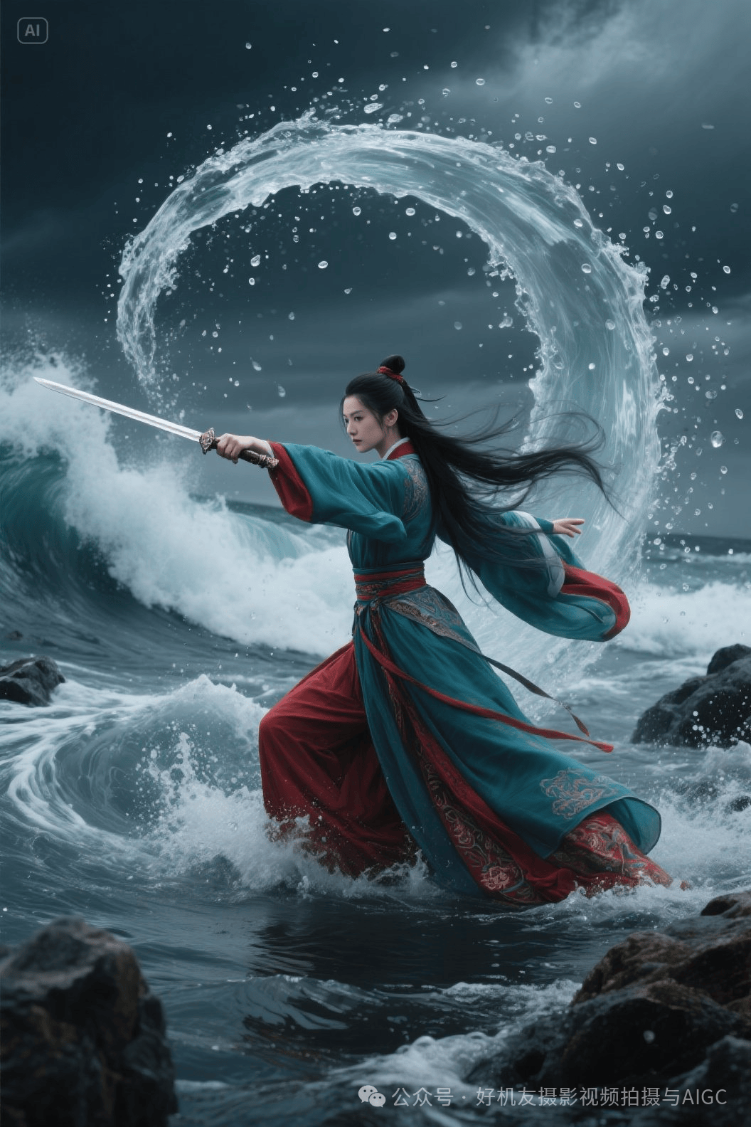 即梦图片更新了图片3.0模型,其生图功能如今已变得很强了,能够通过简洁的提示词在瞬息间创作出栩栩如生、富有想象力的精美画面,涵盖各种风格和主题。接下来,让我们一起欣赏由这些精心设计的提示词所生成的创意图片!提示词:武侠电影风格,身穿青色与红色华丽汉服长袍女侠,俊朗,长袍与长发夸张地飘扬,双臂伸向前方,右手执宝剑,指向前方,作出魔法攻击动作。围绕着双臂。有巨大的透明漩涡水流,,空中飘荡着密密麻麻的细小水滴,背景是滔天巨浪,弓步,,脚下水面呈现巨大漩涡水流,水流激荡翻滚,水面密密麻麻的水滴浮向上空。暗黑风格。阴云天空。礁石密布。