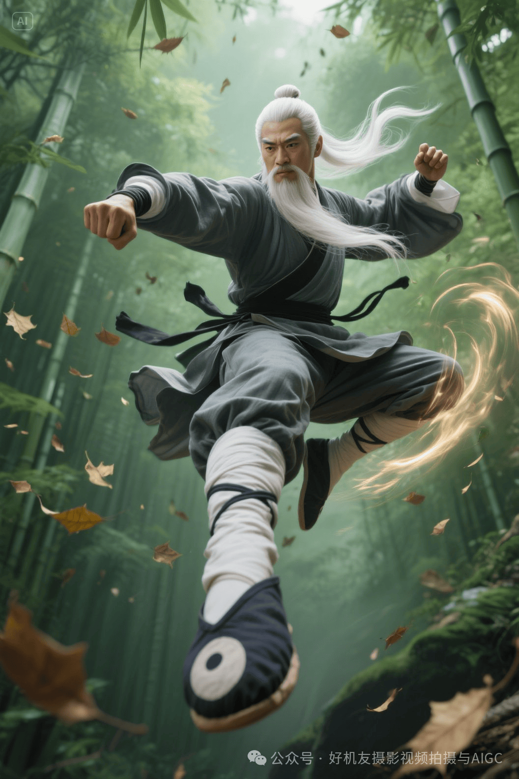 提示词:男性武者腾空飞踢,鱼眼畸变仰拍视角强化足部透视冲击,中华传统道教服饰。道教传统阴阳布鞋。三缕长髯。仙风道骨。白色长发。成气浪特效,8K超清捕捉腿部肌肉线条和布料拉伸纤维,绿色竹林背景落叶飘散。在空中。,虚幻引擎渲染速度线残影,写真风格