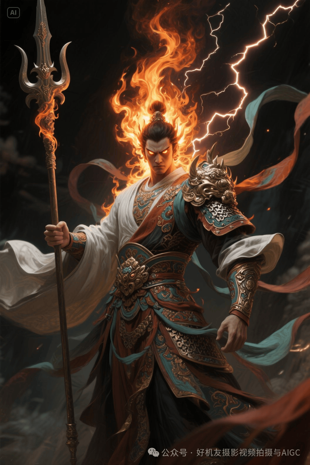 提示词:他身披敦煌华丽战甲,手持长矛,衣袂飞扬间尽显威严。怒目圆睁,似要洞察世间一切虚妄。周身散发着磅礴气场,仿佛是守护正义的神祇,于黑暗中屹立,以不可侵犯之姿,浓浓的氛围感拉满,虚焦,过曝,景深,层次丰富,写意,概念艺术,超写实,高级感。周身火焰缭绕,眼睛中有雷电闪烁。