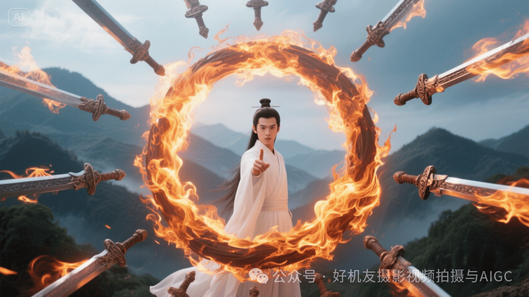 提示词:层层叠叠的火剑组成环形,环形中间是身穿白袍的年轻男修真者,右手两指指向前方,武侠大电影风格,远景青山如影,玄幻,唯美,惊艳,高清,真人摄影写真